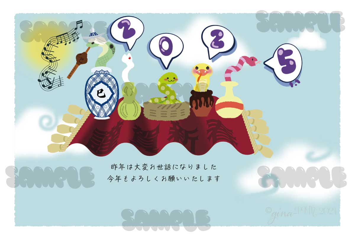 壺などの一部の入れ物をひょうたんや梅干しを漬けそうな丸かめで、アジアや日本らしい雰囲気にして、蛇は2025の5からとって5匹にしました。「謹賀新春」と書かれた空飛ぶ絨毯の上で、先頭のコブラ がプーンギという笛でお正月の歌(もーいくつ寝ると〜♪)を吹きます。楽譜はその音符です。それに合わせて、他の蛇たちが踊ります。空には初日の出が輝きます。