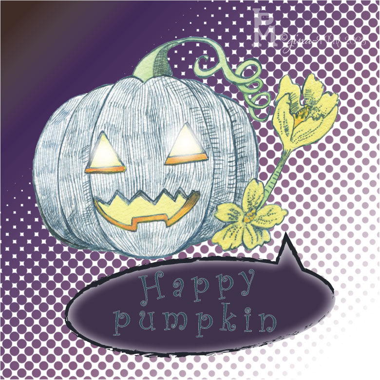 ハロウィンのパンプキンを細いペン画で表現して、横にかぼちゃの花を生やしました。